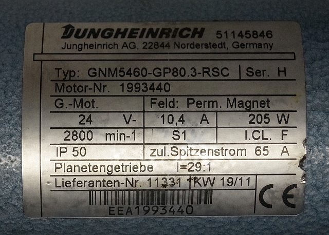 Jungheinrich 51145846 | Steeringmotor 24V type GNM5460 GP80,3 RSC Steering sensor 52037950 year 2011 motor nr. 1993440