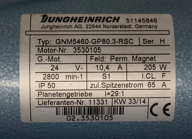 Jungheinrich 51145846 | Steeringmotor 24V type GNM5460 GP80,3 RSC Steering sensor 52037950 year 2014 motor nr. 3530105