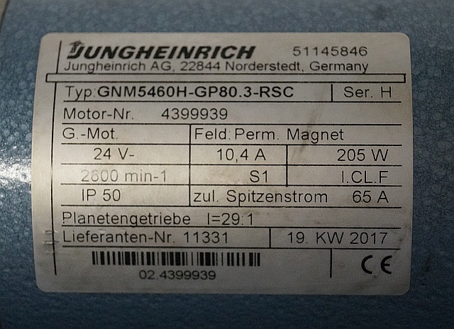 Jungheinrich 51145846 | Steeringmotor 24V type GNM5460 GP80,3 RSC Steering sensor 52037950 year 2017 motor nr. 4399939